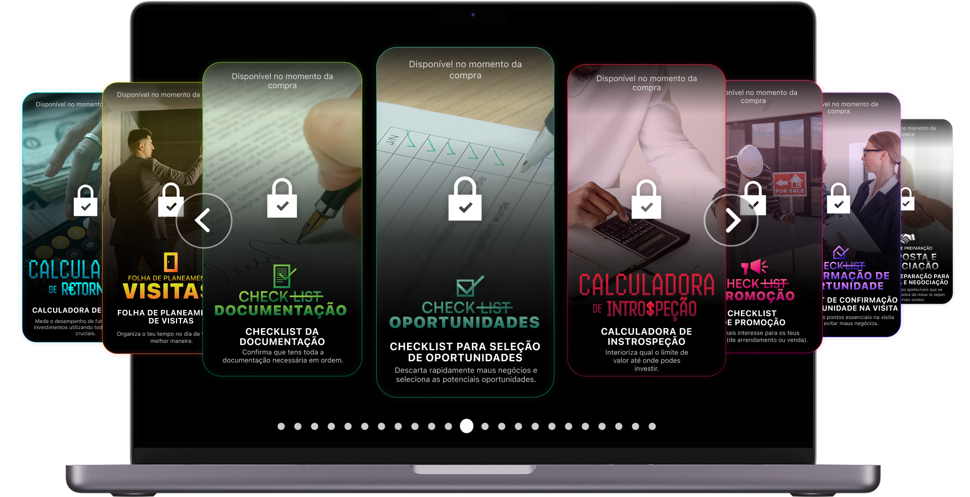 Os instrumentos de trabalho que apoiam a implementação, incluindo modelos financeiros, comparadores de oportunidades, checklists de processos, fichas de análise e outros recursos testados e utilizados pelo João Zoio nos seus próprios investimentos imobiliários.